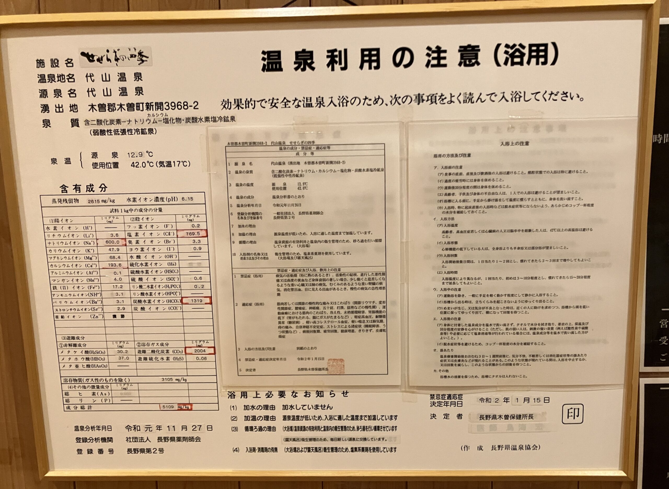 さらに、公式は成分量が多い(効能成分が多い)点を強調しています。館内掲示の成分表(添付写真:温泉利用の注意・分析掲示)でも、源泉温度の低さ(冷鉱泉)や成分表示が読み取れ、ここが“加温して楽しむ濃いめの湯”であることが伝わります。